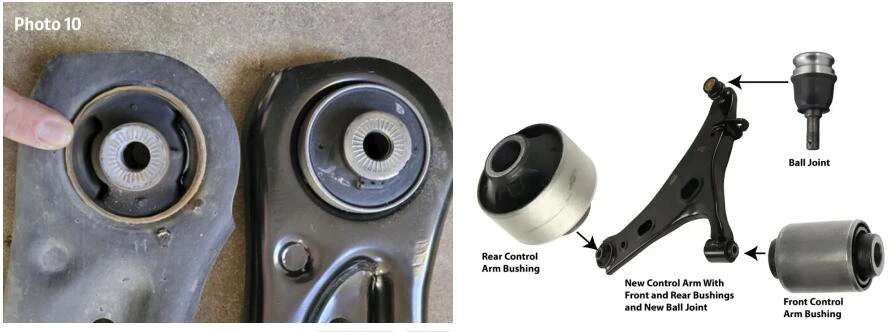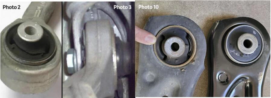 (வழக்கமான சேதத்தை சித்தரிக்கும் புகைப்படங்கள்: விரிசல், கிழிந்த மற்றும் சிதைந்த கட்டுப்பாட்டு கை புஷிங்ஸ்.)