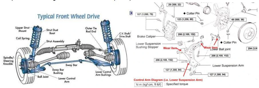 (சஸ்பென்ஷன் அமைப்புகளில் நிலையான கட்டுப்பாட்டு கை புஷிங் இடங்களை காட்டும் வரைபடங்கள்.)