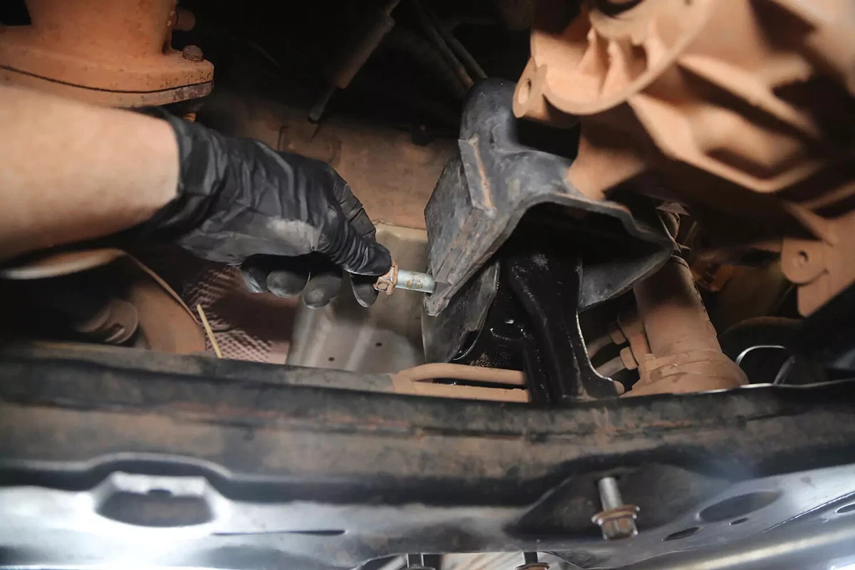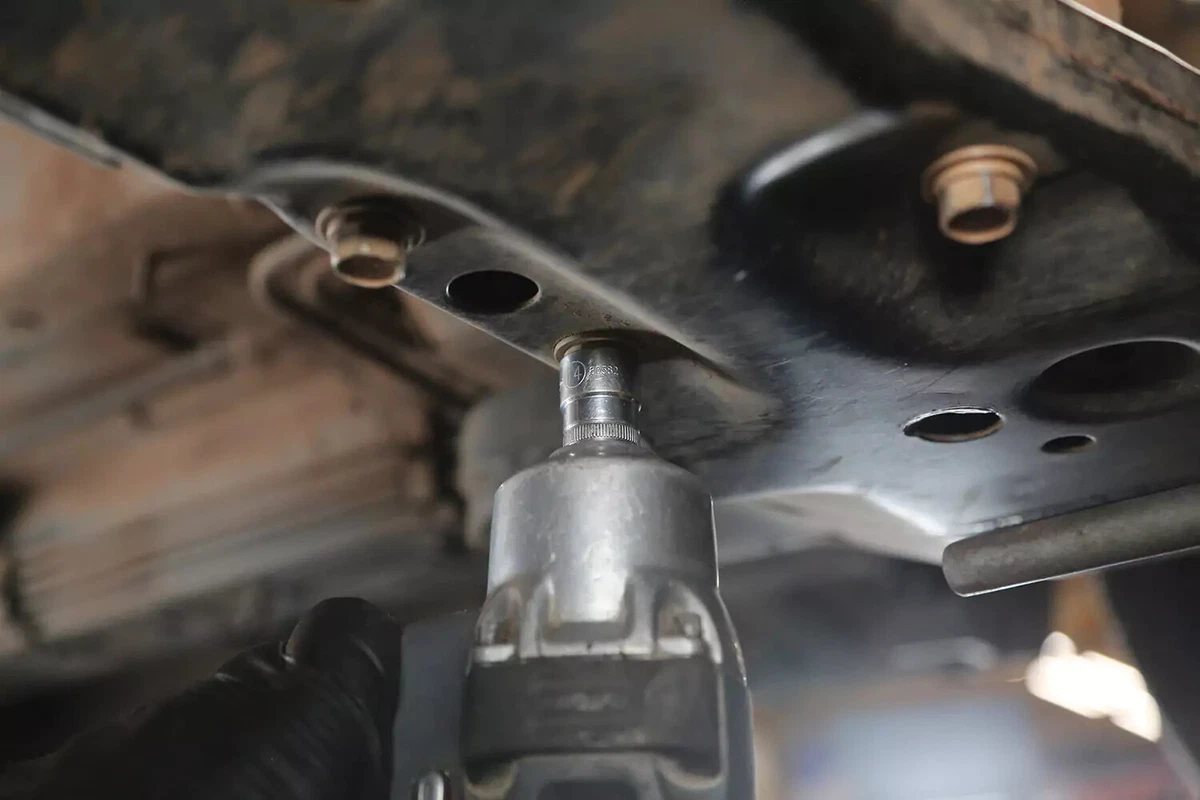 எங்கள் டெமோ வாகனத்திற்கு, மவுண்டில் சப்ஃப்ரேமில் மூன்று போல்ட் மற்றும் டிரான்ஸ்மிஷனுக்கு ஒரு போல்ட் உள்ளது. மேலும் நான்கு போல்ட்கள் டிரான்ஸ்மிஷன் மவுண்ட் பிராக்கெட்டை டிரான்ஸ்மிஷனுடன் இணைக்கின்றன. பெரும்பாலான வாகனங்களில், இவற்றை அகற்ற வேண்டிய அவசியமில்லை.