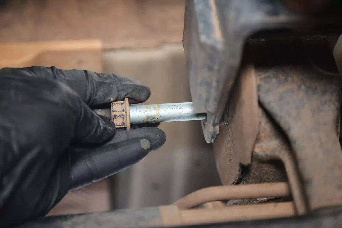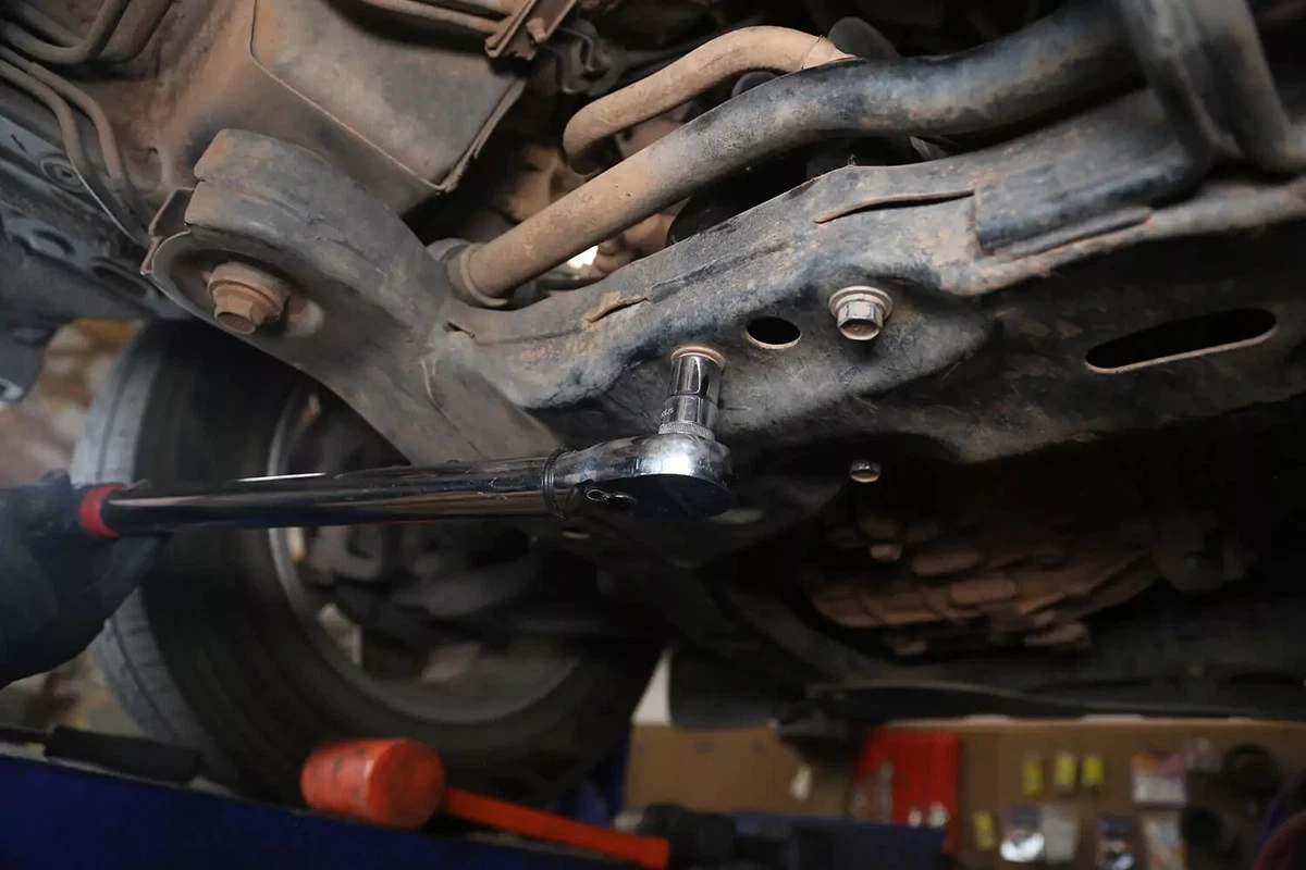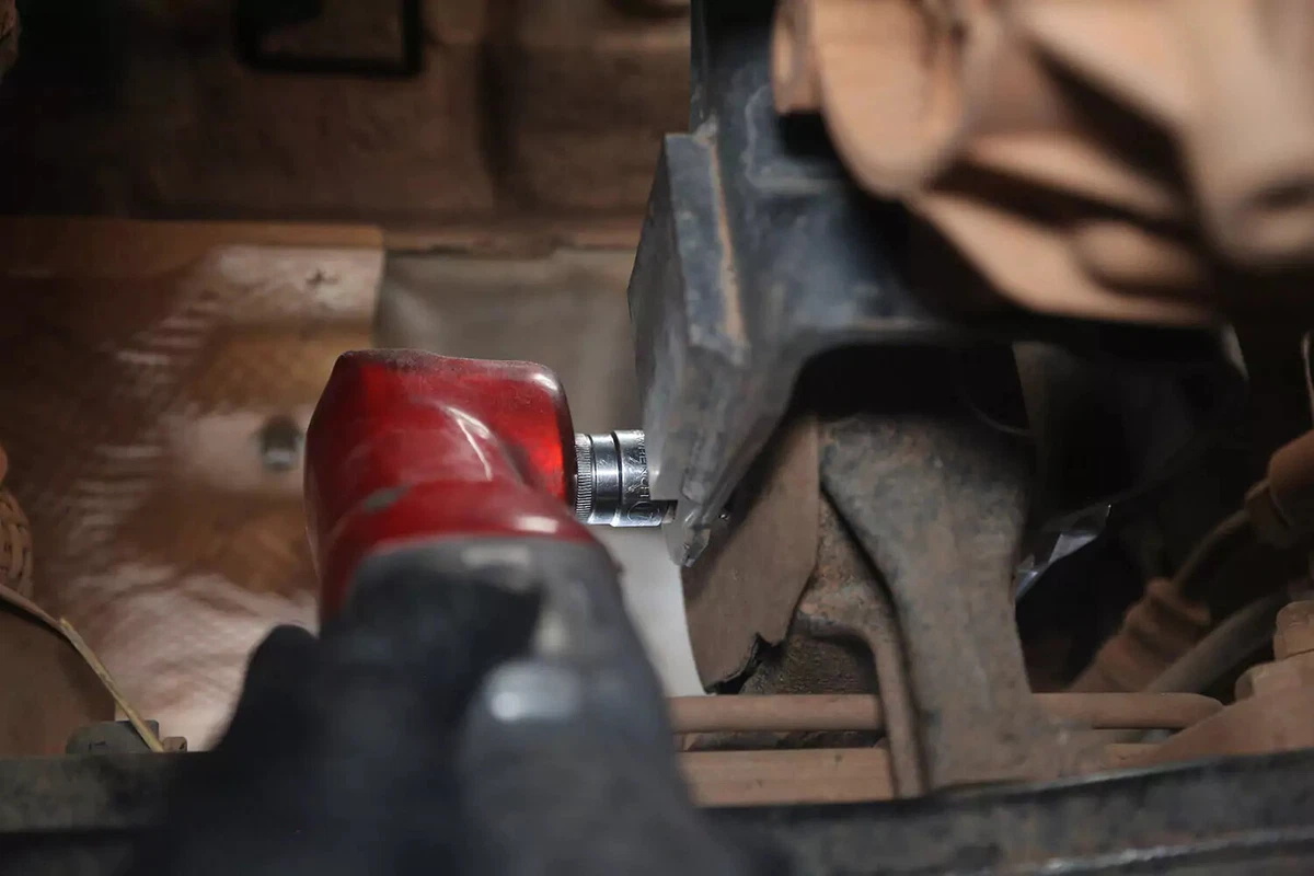 எங்கள் டெமோ வாகனத்தில் கிராஸ்போல்ட் உள்ளது, இது ஒரு பக்கத்தில் குறடு மற்றும் மறுபுறம் சாக்கெட்டைப் பயன்படுத்தி அகற்றப்படும். இறுக்கமான பகுதிகளில் இவற்றை அகற்றுவது கடினமாக இருக்கும். தேவையான அந்நியச் செலாவணியைப் பெற, பிரேக்கர் பட்டை, தாக்கக் குறடு அல்லது ஏமாற்றுப் பட்டியைப் பயன்படுத்தவும்.