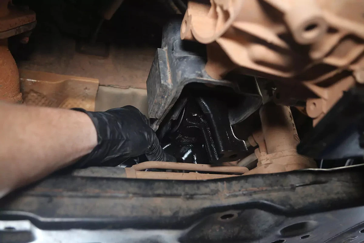 எங்கள் FWD டெமோ வாகனத்தில், டிரான்ஸ்மிஷன் மவுண்ட் முன் சப்ஃப்ரேமில் டிரான்ஸ்மிஷனுக்குப் பின்னால் அமைந்துள்ளது. உங்களிடம் AWD, 4WD அல்லது RWD வாகனம் இருந்தால், மவுண்ட் அநேகமாக டிரான்ஸ்மிஷனின் பின்புறத்தில் இருக்கும், கிட்டத்தட்ட நேரடியாக காரின் அடியில், டிரான்ஸ்மிஷனுக்கும் கிராஸ்மெம்பருக்கும் இடையில் மையமாக இருக்கும்.